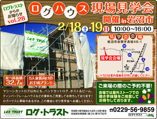 マシーンカットログハウスの 現場見学会を開催いたします。 今年 初の開催は ただいま岩沼市で建築中の物件を オーナー様のご厚意でお借りしての開催となります。 開催日時 2017年 2月 18日(土)・19日(日)の2日間…