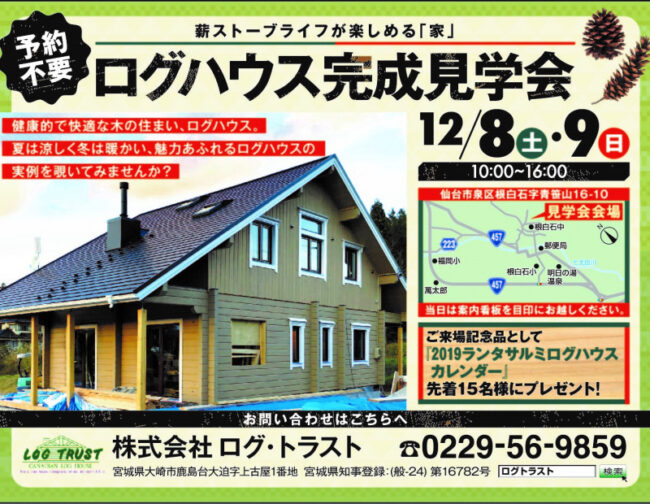 完成見学会開催いたします。in根白石第二弾 新着情報By ログトラスト2018年12月7日突然ですがマシーンカットログ完成見学会を開催致します。 師走に入り 忙しい時期とは思いますが 是非ご覧いただきたい完成直前のログハウスです。 オーナー様のご厚意により完成見学会を開催致します こだわりの詰まったログハウス…