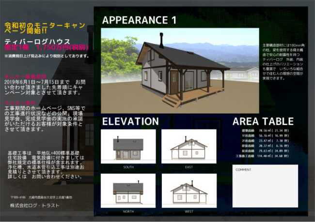 木の家ティバーログモニターキャンペーンを開始いたします。 「令和」初のモニターキャンペーンです 限定1棟 通常価格 1,900万円 ↓↓↓ モニター価格 1,750万円(税別)の募集となります。 (建物面…