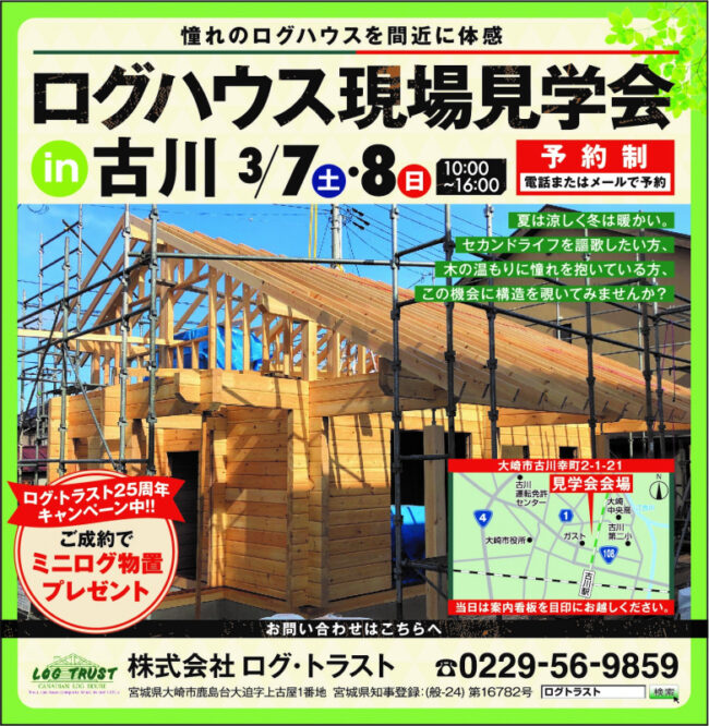 2020年初の見学会となります今回は県北の大崎市で マシーンカットログの現場見学会を開催致します。 延べ床面積28坪で住宅地の中に建つ二階建てのログハウス 3LDK+フリースペースに広いウッドデッキ 家族構成やライフス…