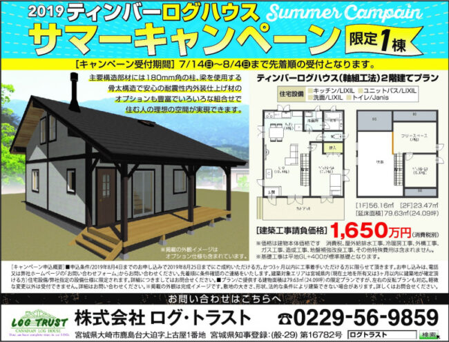 2019ティバーログハウス サマーキャンペーン開始 限定1棟 キャンペーン受付期間「7/14(日)~8/4(日)」まで 先着順で受付となります。 申込方法は 電話0229-56-9859 又はホームページのお問い合わせ…