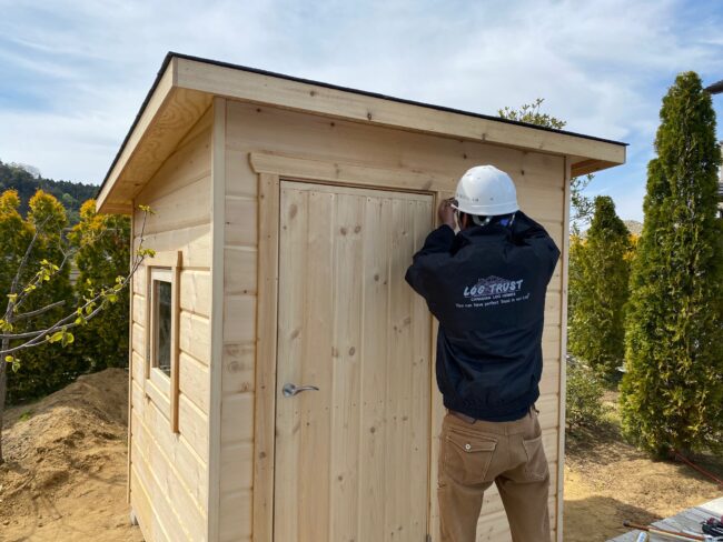 松島町 K様邸のお庭に 1.8m×3.0m 3畳タイプのホビーハウス&バイクハウスを 施工させて頂きました。 ご家族の趣味 キャンプやアウトドアーの道具が収納されるのかな これがあれば…