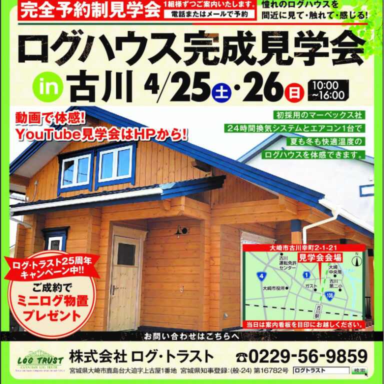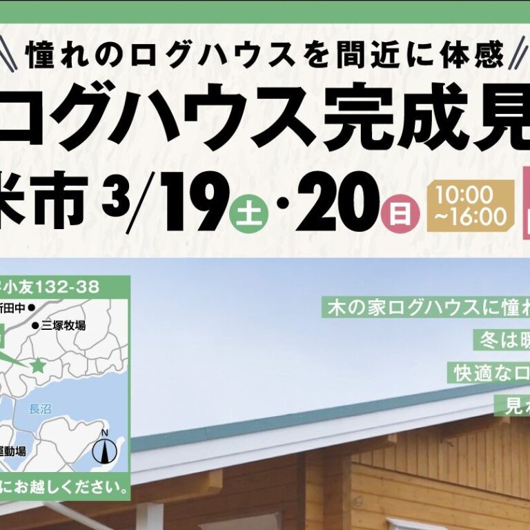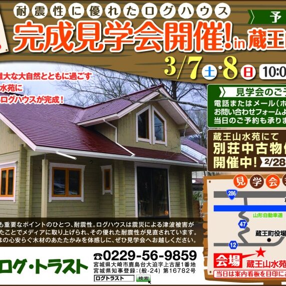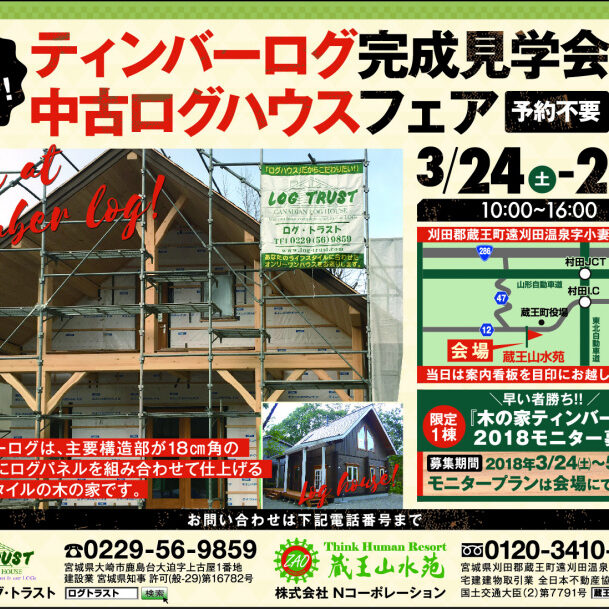 3月24日(土曜)・25日(日曜)の2日間 蔵王町「山水苑 せせらぎの里」にて ティンバーログ完成見学会を開催いたします。 昨年の「ティンバーログモニターキャンペーン」でご応募頂きました物件が完成 現物をご覧頂きながら …