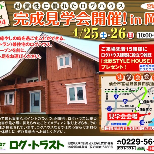 4月25日(土)26日(日)の2日間 仙台市宮城野区にてマシーンカットログハウスの完成見学会を開催致します。 今回の 建物は店舗兼用住宅で5月末ごろには レストランしてオープン予定となっておりますが 今回はオーナー様のご…