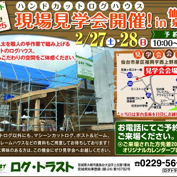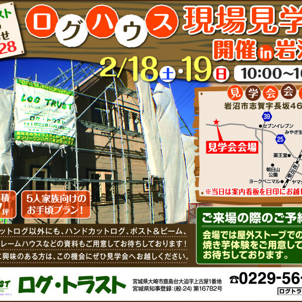 マシーンカットログハウスの 現場見学会を開催いたします。 今年 初の開催は ただいま岩沼市で建築中の物件を オーナー様のご厚意でお借りしての開催となります。 開催日時 2017年 2月 18日(土)・19日(日)の2日間…