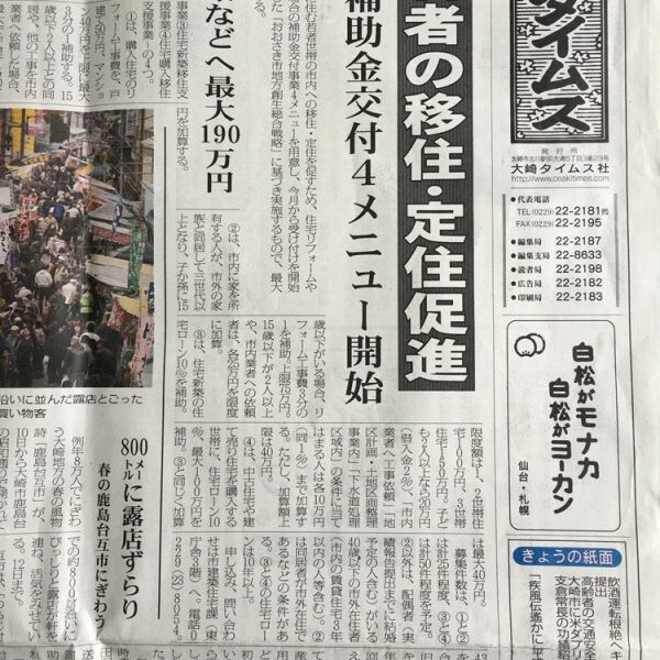 新聞 大崎タイムスによりますと 弊社があります宮城県大崎市に 市外から移住を考えていて新築、住宅購入また購入物件のリホームなどされる方に 補助金交付の4メニューが開始されたようです。 「おおさき市地方創生総合戦略」に基づ…