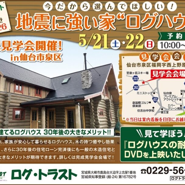 5/5(土)・6(日)の二日間 ログハウス相談会を開催致します。 会場は 仙台市泉区福岡字西上野原28-10 ウッディアビレッジ 時間 AM10:00 ~ PM4:00 ログハウスの新築をご検討のお客様対…