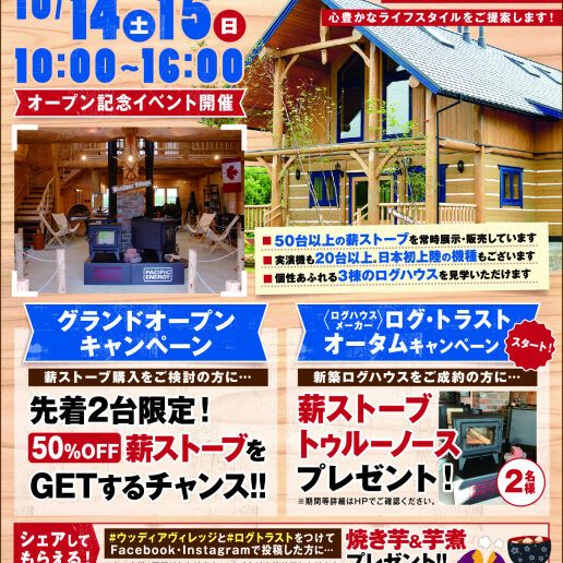 WooDear Villageのグランドオープンと同日10月14日~11月13日までの 1ヶ月間オータムキャンペーンを実施いたします。 期間中 新築ログハウスをご成約先着「限定2台」薪ストーブ本体 「パシヒックエナジー …