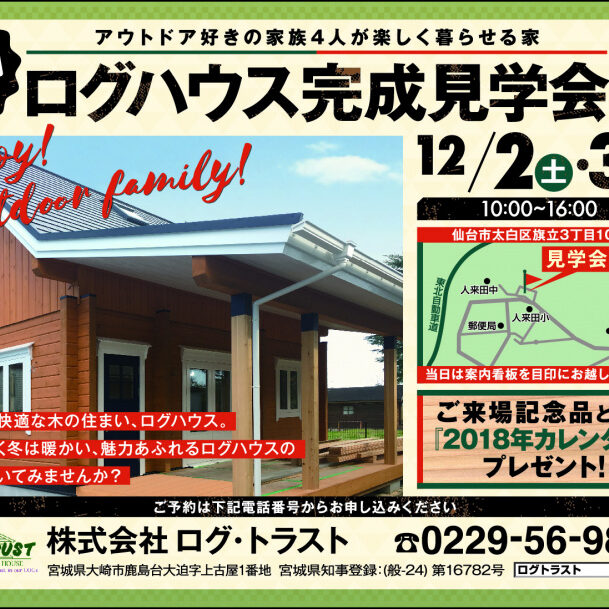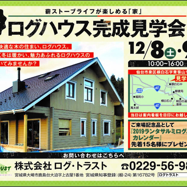 12月2日(土)、3日(日)の二日間 仙台市太白区にてマシーンカットログハウスの完成見学会を開催いたします。 開催地は 住宅地内にとなっておりますので ご近所様のご迷惑にならないように 今回は完全予約制と させて頂きます…