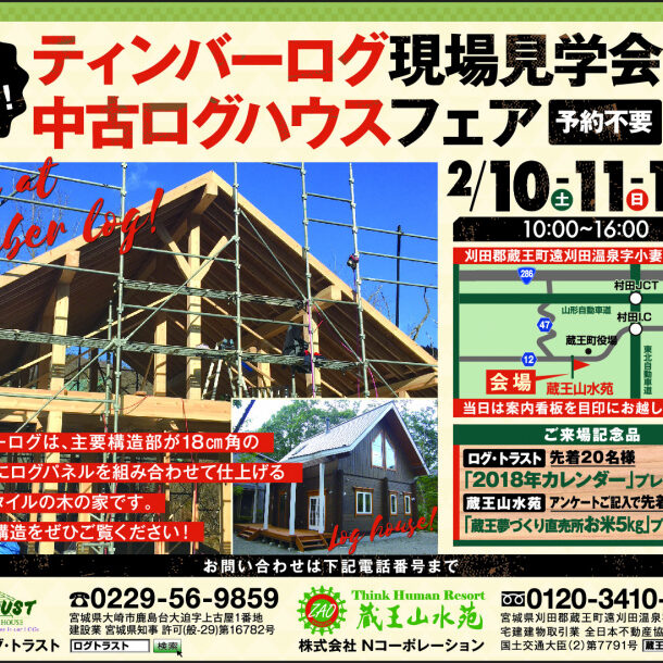2月10・11・12日の3日間 蔵王町「山水苑 せせらぎの里」にて ティンバーログ現場見学会を開催いたします。 昨年5月~6月実施の「ティバーログモニターキャンペーン」でご応募いただきました お客様のティン…