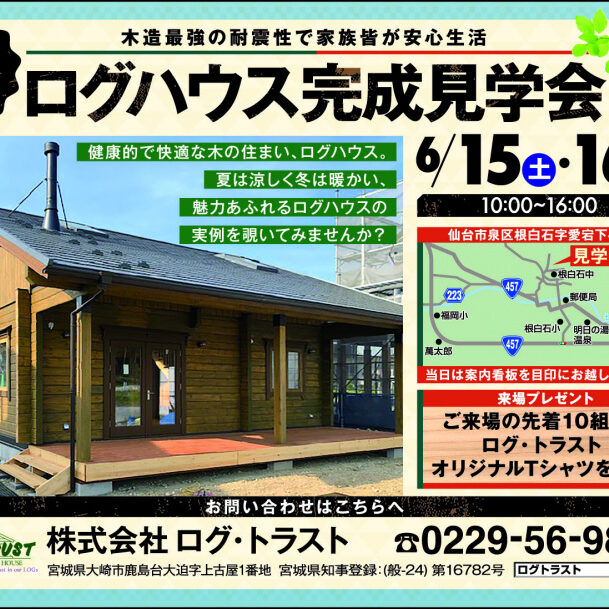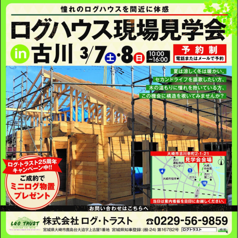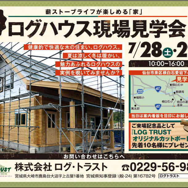 7月28・29の2日間 仙台市泉区根白石 にて 140mmマシーンカットログ現場見学会を開催いたします。 当日は ご来場者さま先着10名様にLOG・TRUSTオリジナルのカットボードプレゼント!! 会場で …