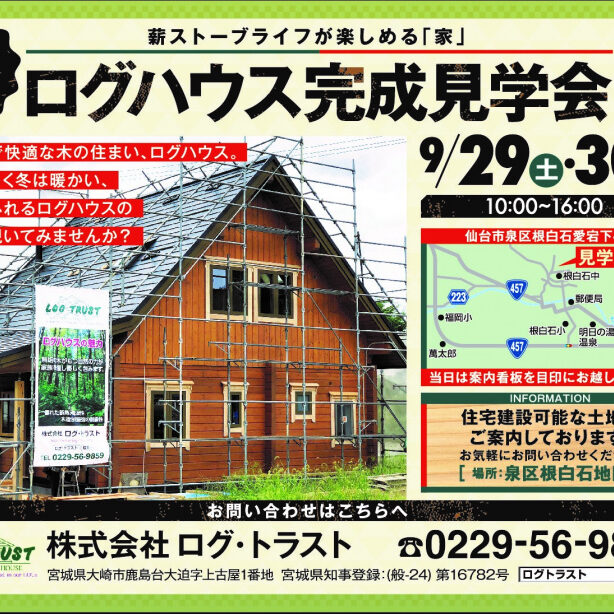 9月29日(土)・30日(日)の2日間 ログハウス完成見学会を開催致します。 会場は 前回、現場見学会を開催した 泉区根白石です。 開催時間は 10:00~16:00 根白石地域の 住宅建築可能な土地情報もご案内いたしま…