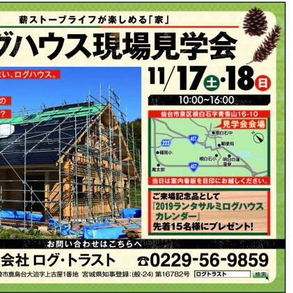 マシーンカットログ現場見学会を開催致します。 会場は 前回同様 泉区根白石エリア 開催日時は 11月17日(土)・18日(日) 10時~16時 ご来場者先着15組のお客様に 2019ランタサルミオリジナルカレンダーをプレ…