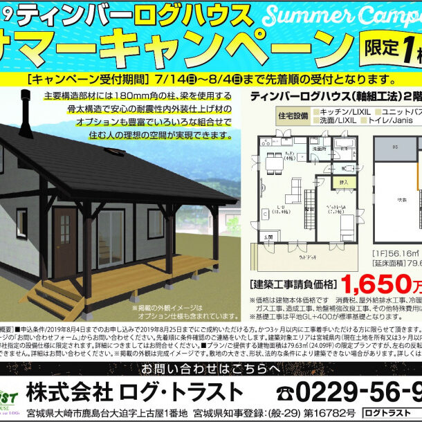 2019ティバーログハウス サマーキャンペーン開始 限定1棟 キャンペーン受付期間「7/14(日)~8/4(日)」まで 先着順で受付となります。 申込方法は 電話0229-56-9859 又はホームページのお問い合わせ…